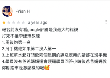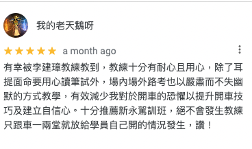 - 這間駕訓班好像其他教練也有在 google map 上被罵,但是我的李教練應該就是籤王了。但即使是籤王也是有人給他 google map 好評,去之前可以先看他被罵的部分自己能不能接受。當然也有遇到人家的教練對我很親切的~算是要挑教練的駕訓班,不知道其他間如何。